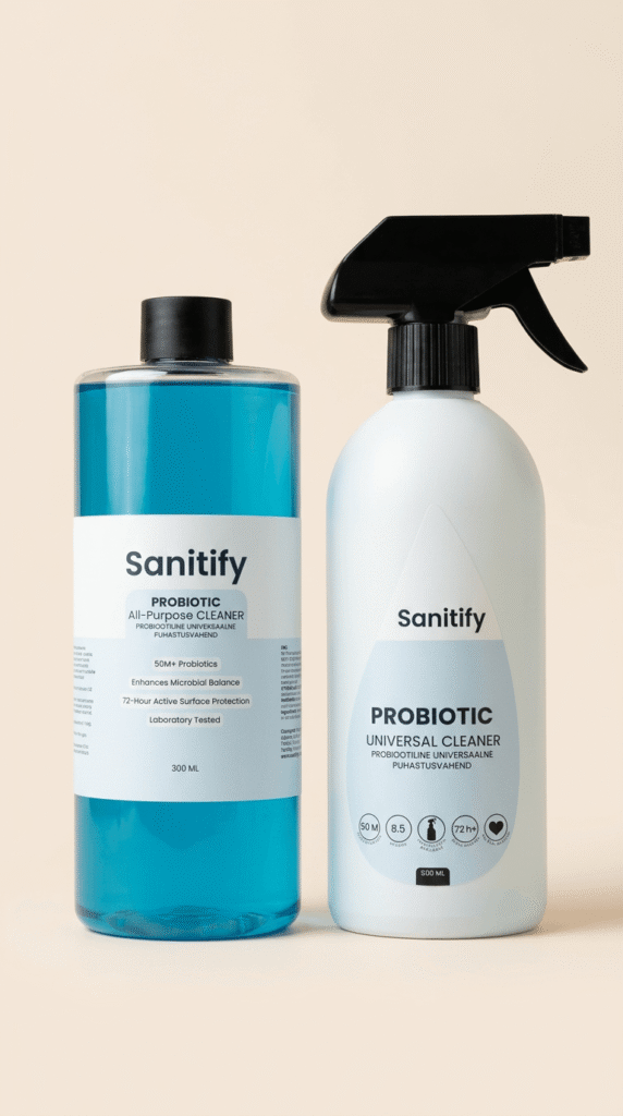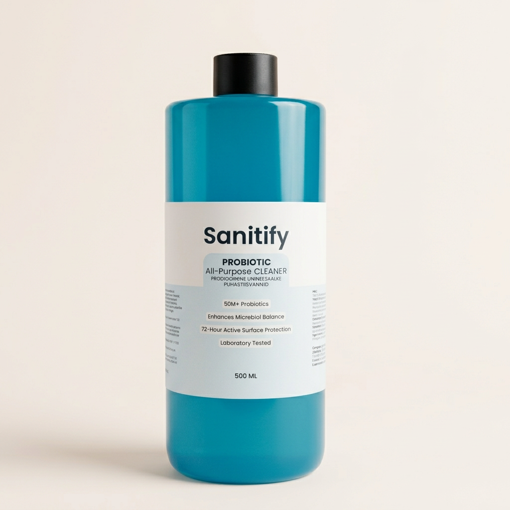 Sanitify probiootiline universaalne puhastusvahend on tõhus kontsentreeritud lahendus, mis sobib ideaalselt igapäevaseks puhastamiseks kõikidele pestavatele pindadele, sealhulgas mööbel, seinad, põrandad ja autosalongid. Pärast puhastamist jätab see pindadele kasulikud probiootilised bakterid, mille positiivne mõju kestab kuni 72 tundi. Need bakterid aitavad luua pindadel tasakaalustatud mikrofloorat, mis toetab tervislikku elukeskkonda, vähendades niiskust ja eemaldades ebameeldivaid lõhnu.